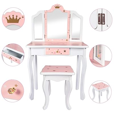 JOYMOR Kids Princess Vanity Table and Chair Set Kids Vanity Set with Mirror Makeup Dressing Table with Two 180 Folding Mirror for Girls. Ships free orders over 39.